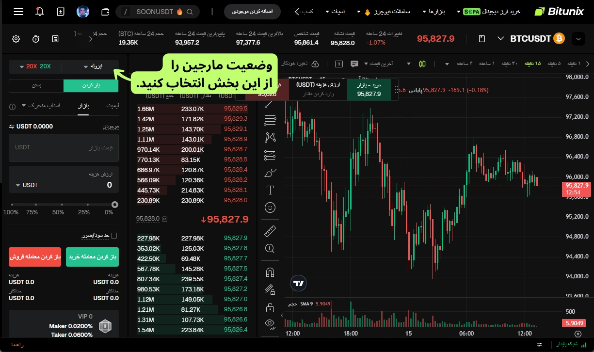 - جفت ارز BTC/USDT یا هر نماد دلخواه را انتخاب کنید.