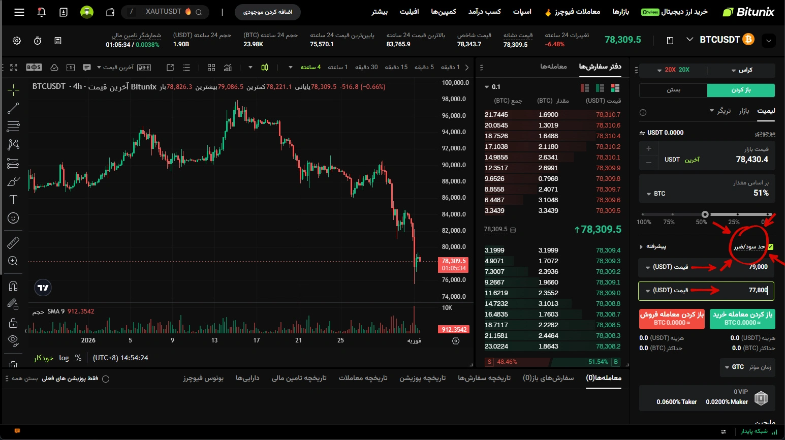 - بر اساس پنل سفارشات در بخش سمت راست صفحه معاملات فیوچرز، پیش از ثبت سفارش، گزینه TP/SL را فعال نمایید.