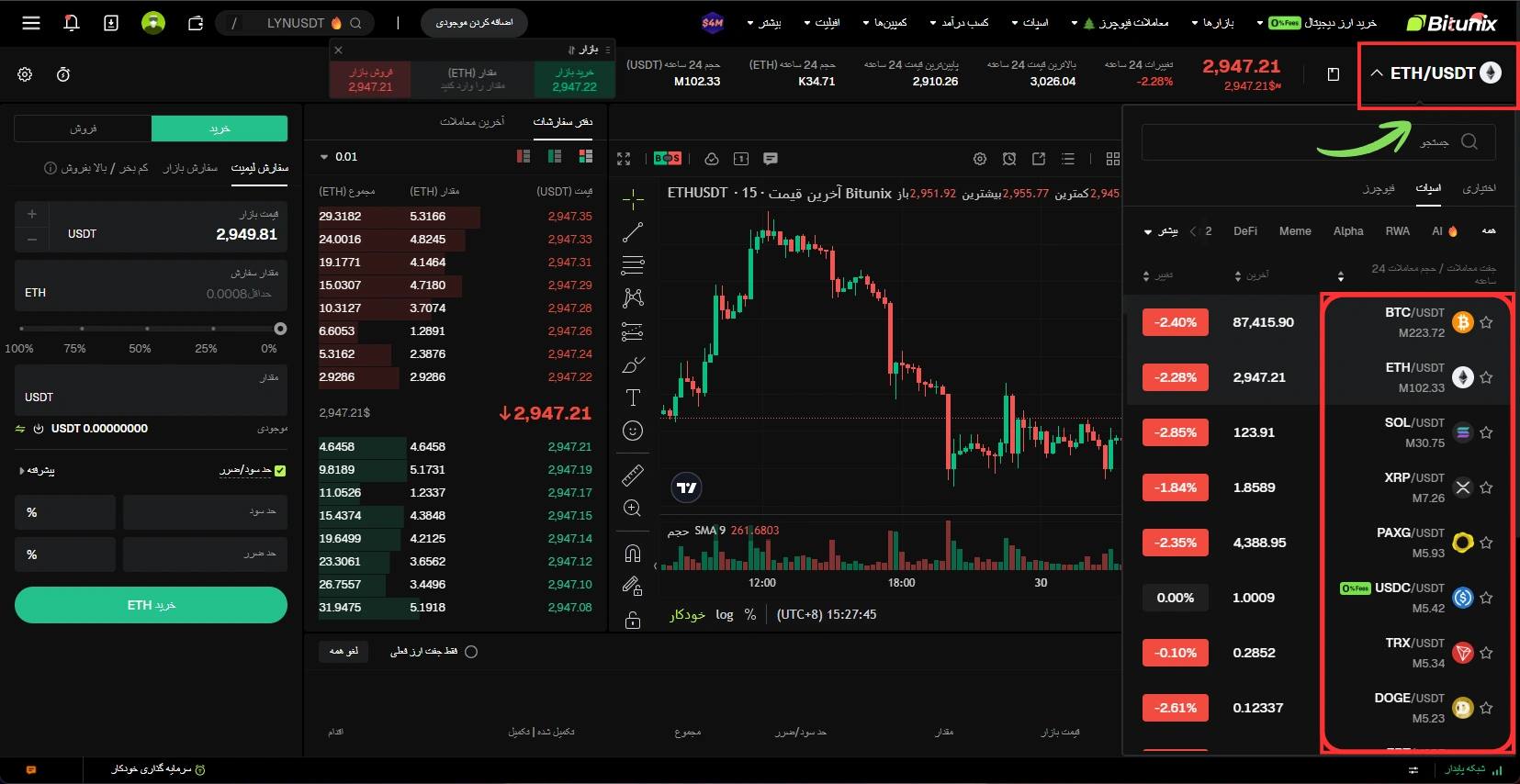 بعد از مشخص شدن نوع معامله، جفت ارز موردنظر (مانند BTC/USDT) از لیست بازارها انتخاب میشود.
