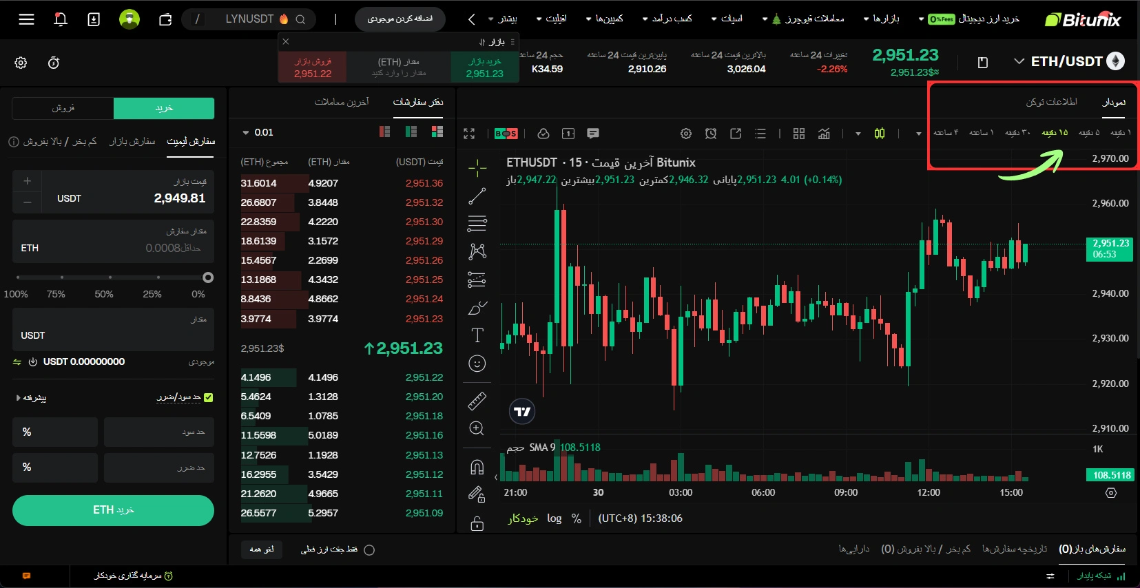 کاربر میتواند بازه زمانی تحلیل (مثل 5 دقیقه، 15 دقیقه یا 1 ساعت) را از نوار بالای نمودار تغییر دهد.