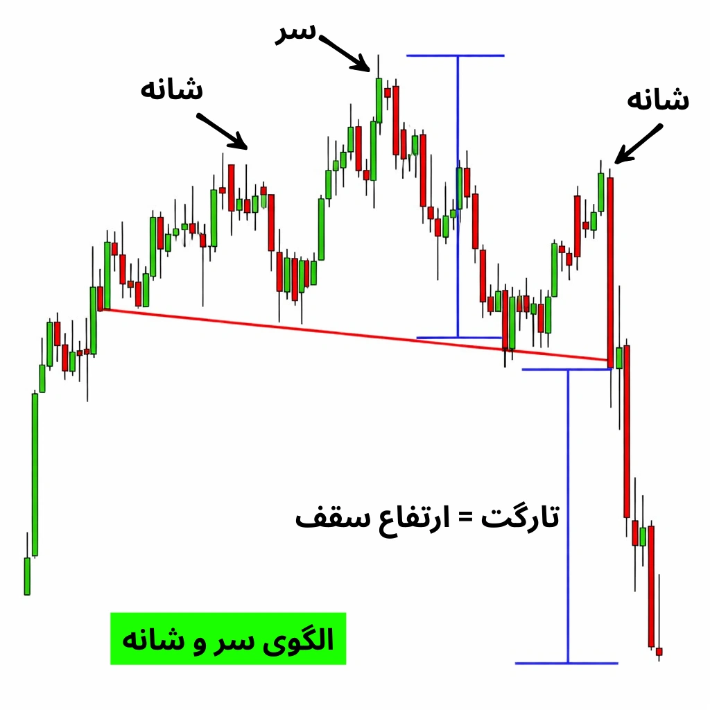 الگوی سر و شانه یک الگوی بازگشتی معتبر است که معمولاً در پایان روند صعودی دیده می شود. این الگو از سه قله تشکیل شده که قله میانی (سر) بالاتر از دو قله کناری (شانه ها) قرار دارد. با شکست خط گردن به سمت پایین، احتمال شروع روند نزولی افزایش می یابد.
