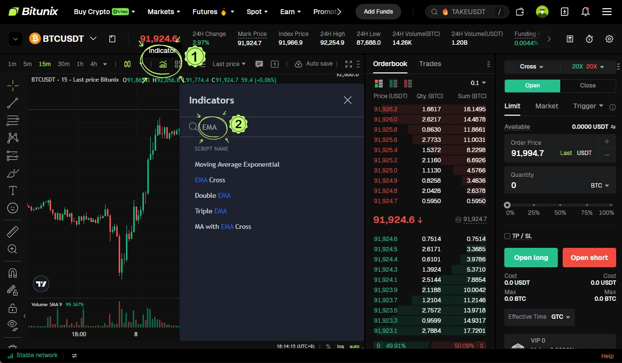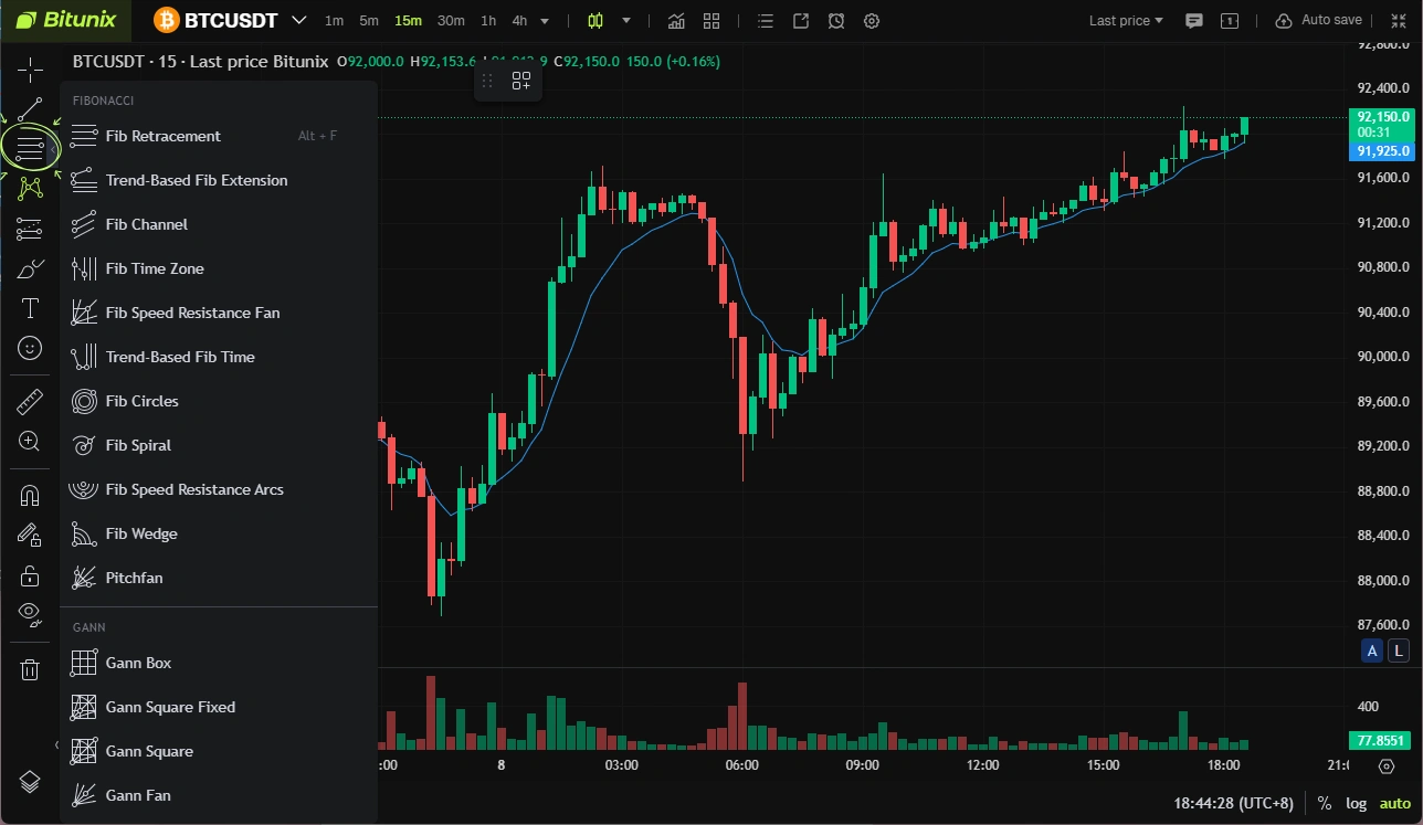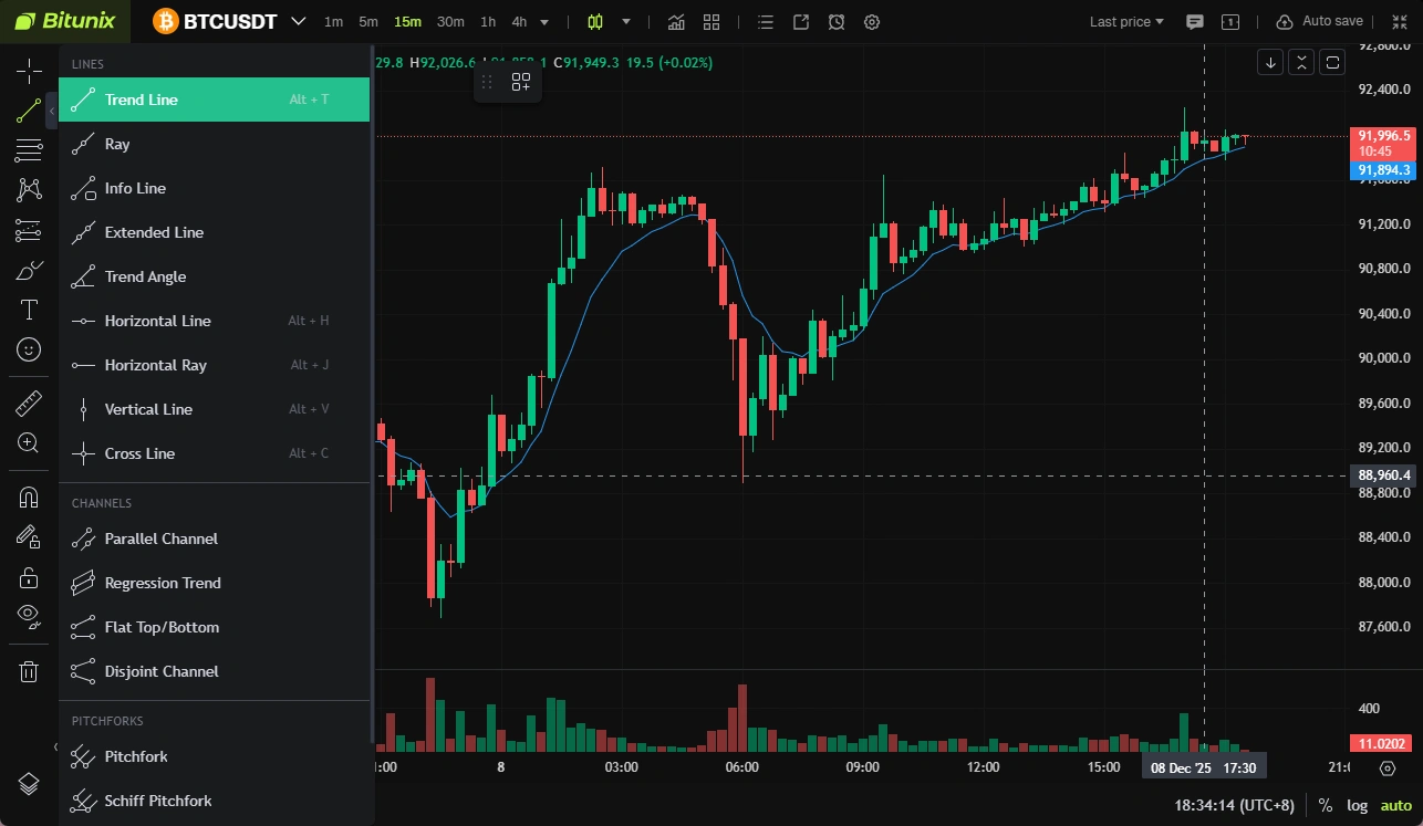 Bitunix این چارت را بهگونهای ارائه کرده که معامله گران بدون نیاز به خروج از صرافی، به مجموعه کاملی از ابزارهای حرفهای تحلیل تکنیکال دسترسی داشته باشند؛ از جمله خطوط روند، فیبوناچی، اندیکاتورها، تایمفریمهای متنوع و حالتهای مختلف نمودار